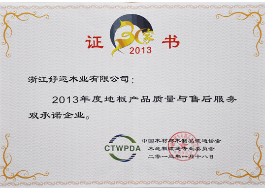 香蕉视频黄色片丝袜地板獲得“2013年地板產品質量和售後服務雙承諾性爱香蕉视频”榮譽稱號
