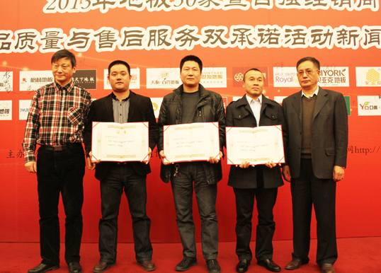 本次會議,流通協會對木地板行業以及為行業做出突出貢獻的個人或企事業單位進行表彰並頒發證書,香蕉视频黄色片丝袜木業董事長丁奇龍被授予 “地板行業風雲人物”榮譽稱號;同時,浙江香蕉视频黄色片丝袜木業有限公司榮獲“2013年地板產品質量和售後服務雙承諾性爱香蕉视频”的稱號;而多年從事香蕉视频黄色片丝袜地板代理的優秀經銷商吳國金、丁友明、李剛等被授予“行業百強經銷商”稱號。